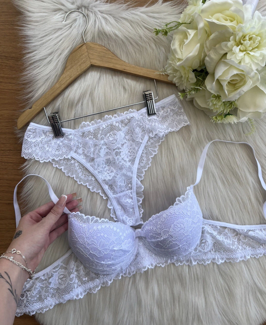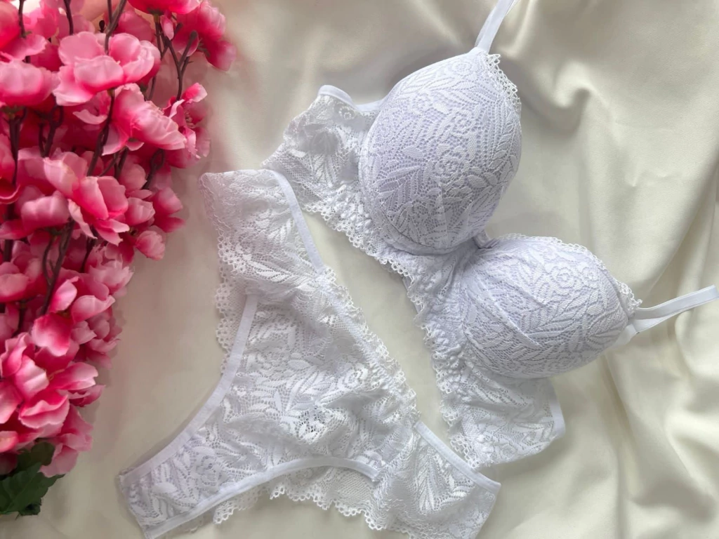 Sutiã: Todo em renda, com bojo, dando um toque de sensualidade a lingerie, com aro de sustentação, e alças finas com regulagem e fecho de 2 níveis.
